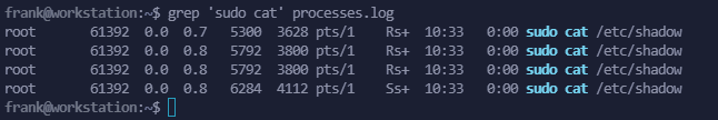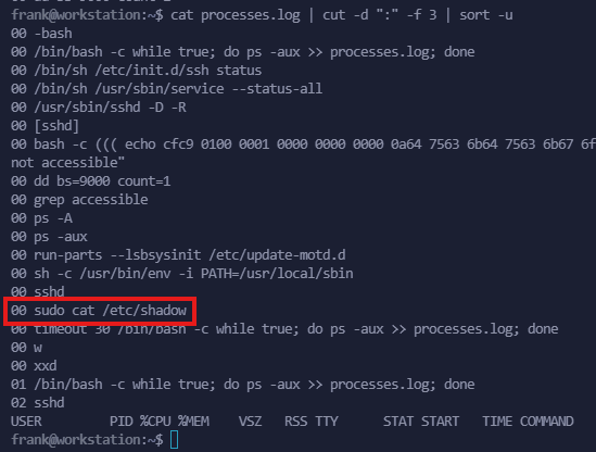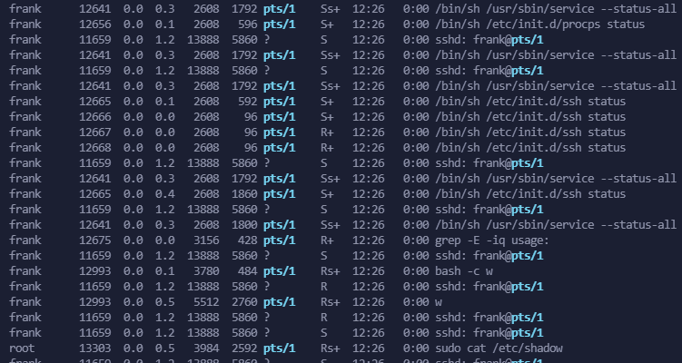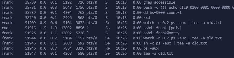 And besides some bash trickery that are constantly running, I notice that someone logs in the machine and executes a command (that doesn’t last long), but still. It’s a hint.