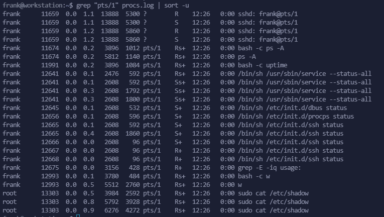 and then we’re donna do some bash magic to extract the command line (not exactly bulletproof) and then remove the duplicates: