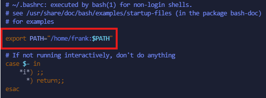 So, we could add at the beginning a path that we can control the content on, slap our binary in there and place our directory in the $PATH variable. To make this “persistence”, we’re going to make this edit in the .bashrc file, which is in frank’s home directory: /home/frank