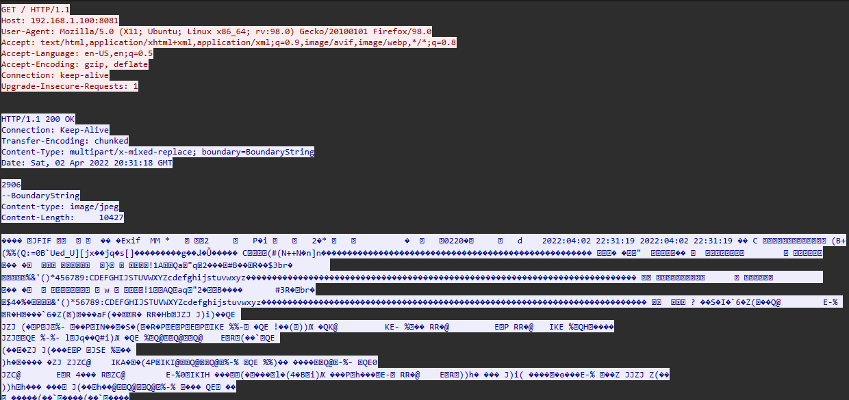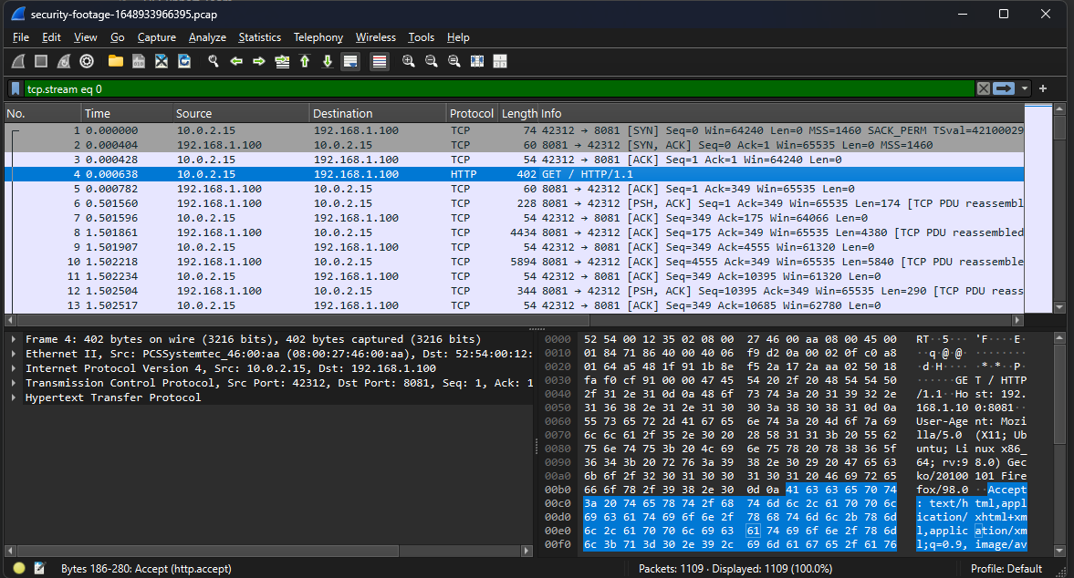 So the file I got is called security-footage-1648933966395.pcap, and it contains one single TCP connection performing a GET HTTP request to http://192.168.1.100:8081/: